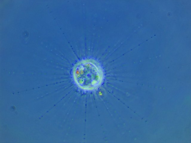 Ist zu viel Bewegung im Wasser, kann das Sonnentierchen seine Axopodien einfahren, und auf bessere