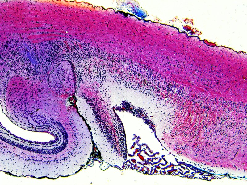 rana esculenta; cerebrum, sagittal (längs), Präparation: Lieder. Planapo 100/1,3, Kpl8x,